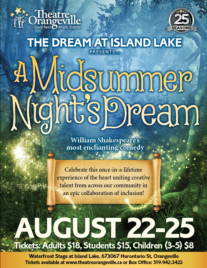 In August of 2019 Theatre Orangeville presents Shakespeare’s most enchanting comedy, A Midsummer Night’s Dream like you’ve never seen it before.