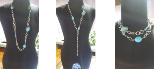 One of a Kind, handmade for Victorian Christmas, sterling silver and turquoise, textured, double-strand bracelet with matching 38” silver and turquoise station chain that can be worn long or doubled up. Turquoise cabochon gemstones from the Kingman Mine in Arizona. Value $800