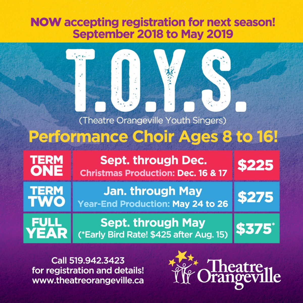 The Theatre Orangeville Youth Singers (T.O.Y.S.) continue to be an integral part of Theatre Orangeville's mandate to offer quality programs for young people in our community, and this year they’re back with new opportunities! T.O.Y.S. members will develop a general appreciation of vocal music and receive specific training in choral skills. Emphasis on teamwork and performance will build up self-confidence in each member. T.O.Y.S. run from September to May and choir members will star in their very own Christmas production, as well as their yearend production. (Full year, or single term options are available).