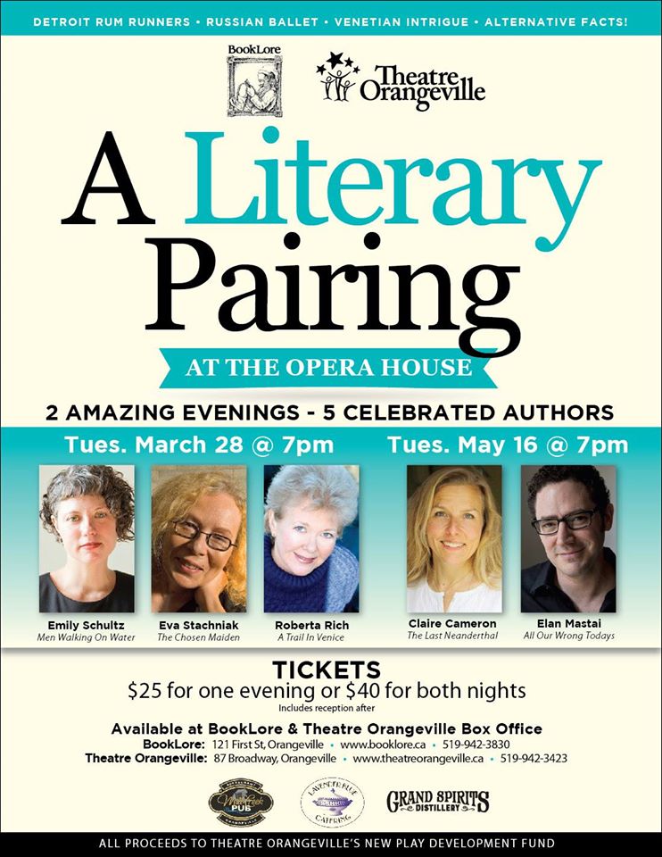 We’re hoping that Nancy’s latest venture to support Theatre Orangeville will be equally irresistible to book lovers. A Literary Pairing, Part Two happens in the Opera House, Tuesday May 16th at 7 pm. And because it’s a Nancy event, there will be excellent authors – Claire Cameron (The Last Neanderthal) and Elan Mastai (All Our Wrong Todays) – great questions and free libations, all for the price of a ticket. Tickets are $25 and are available at BookLore and theatreorangeville.ca.