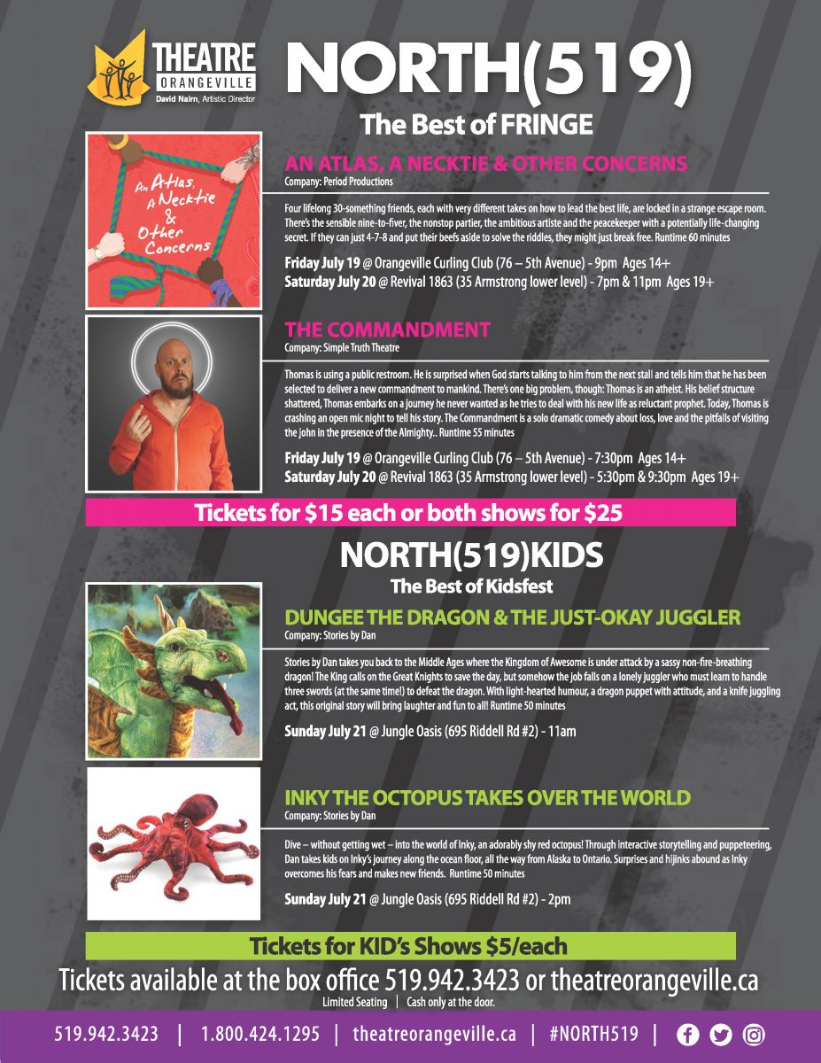 Hanging out on the edge of the performing arts, Theatre Orangeville is ecstatic to announce our 2019 selections for NORTH(519) Best of Fringe are The Commandment, and An Atlas, A Necktie & Other Concerns coming to the Orangeville Curling Club, Friday July 19 and Revival 1863 on Saturday July 20 — these dates only.