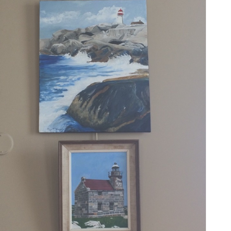 Susan, who is a lifelong dabbler in the arts, prides herself in finding a visual theme to correspond with the dramatic content of each main stage production. Currently five artists have contributed lighthouse paintings to illustrate The Ghost Island Light, a comedy/thriller playing until Nov. 6, including works by our own Kay MacGregor, retired house manager. - Bernadette